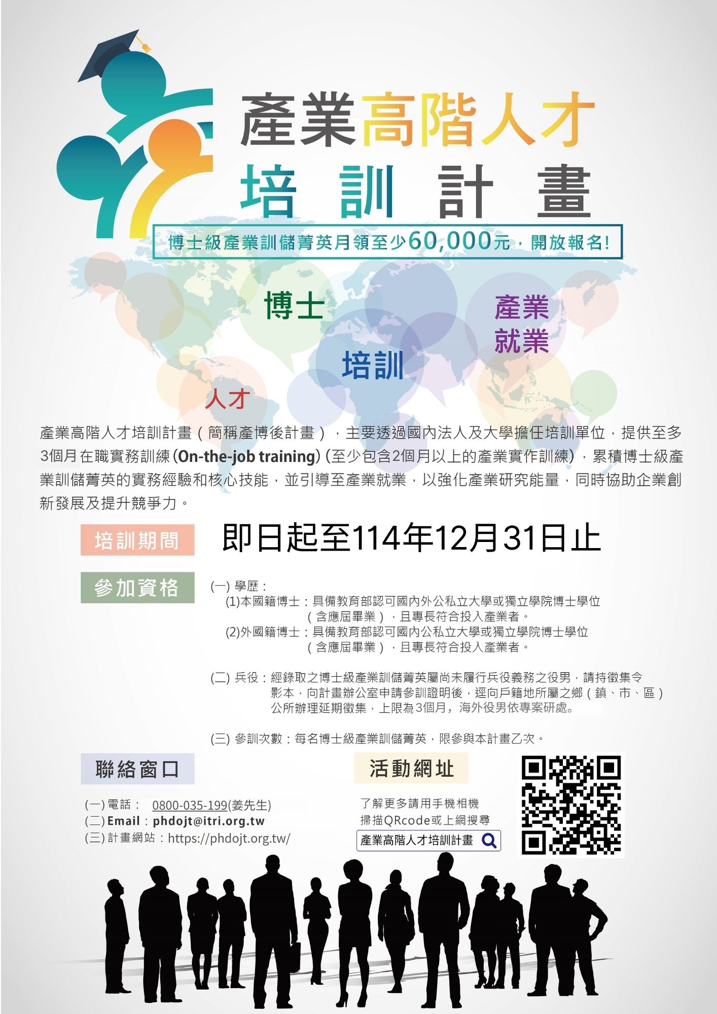 - 二、為增進培訓單位與博士級人才面談機會,訂於114年10月22日(三) 台南大飯店、114年10月27日(一) 政大公企中心,辦理人才甄選會,活動報名連結:https://forms.gle/2VDiW2KvGpSERrDi9。或至計畫網站:https://phdojt.org.tw/查詢相關活動訊息。
